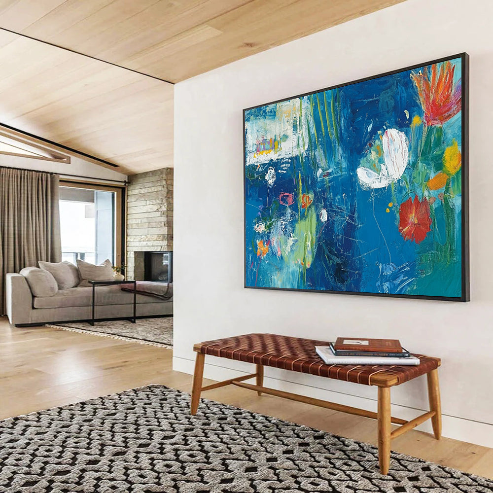 “Blue Floral Abstract” depicts colorful flowers on a blue abstract background. Drawing from Impressionist florals, it captures a dreamy garden vibe. Great for a bedroom or a cozy reading nook, adding a serene, artistic feel. A peaceful, blooming piece—own it to let your space flower with calm! Packing: Rolled and shipped in a solid tube. The painting come with EXTRA 2-3 inch white border around for stretching or framing.Delivery time: You will receive the painting around 7-12 days( 3-5 days to finish the painting, 5-7 days to your home.by UPS And Dhl)