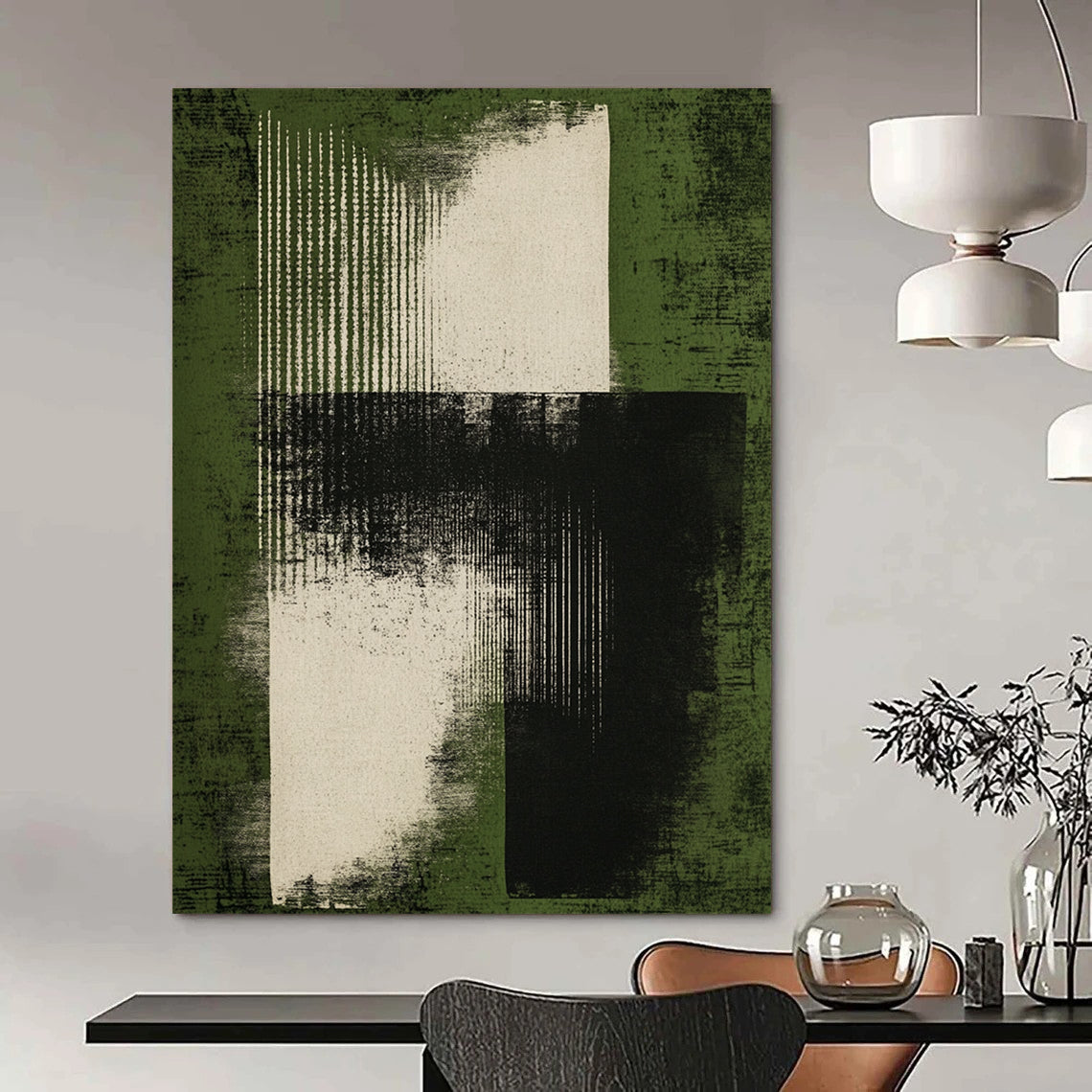 Contemporary abstract art features a minimal black ink brush stroke on a green background evoking mystery and visual harmony with bold gray tones. DLZ1360
