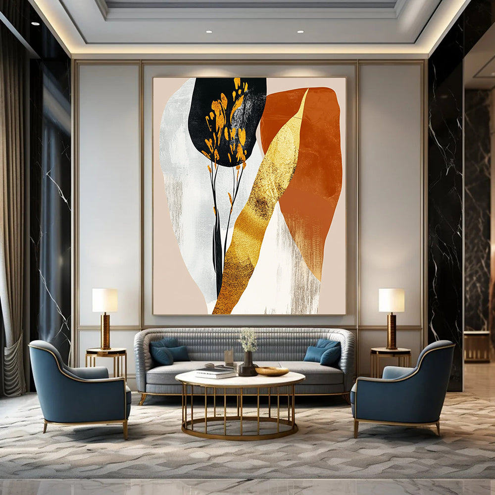 Contemporary abstract art featuring gold foil and pastel orange shapes on a beige background creates a stunning visual impact. DLZ0801