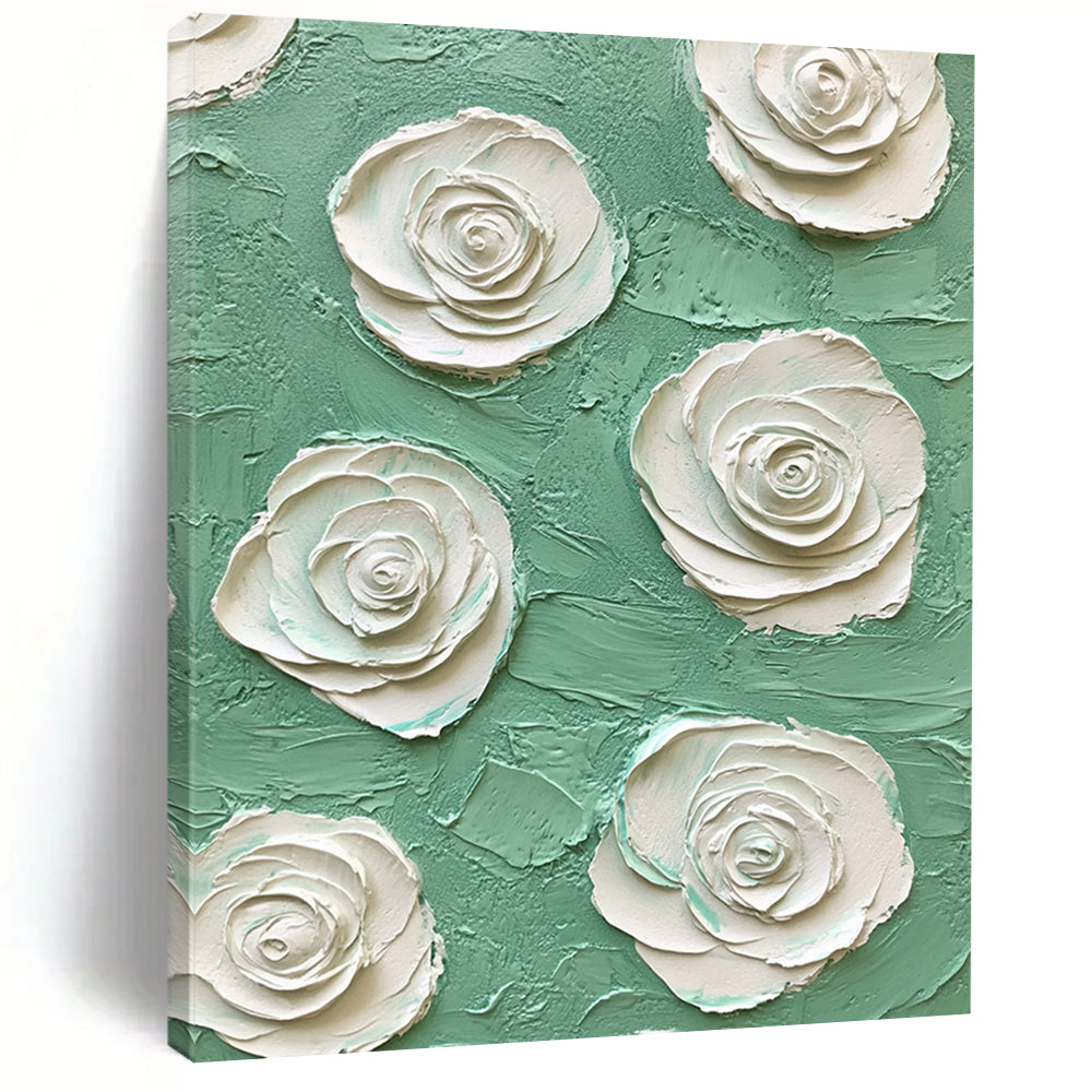 Mint green and white roses embossed on the wall, textured impasto painting.Blend work and leisure seamlessly with our Custom Hand-Painted Abstract Painting. In the office, the painting can feature abstract representations of productivity and focus, while in the living room, it showcases more relaxed, creative themes. Customize it with your favorite colors, shapes, or symbols that resonate with both your professional and personal life. Hand-painted by skilled artisans, it's an excellent choice for "office living room decor" and "custom abstract paintings", bridging the gap between work and home. Packing: Rolled and shipped in a solid tube. The painting come with EXTRA 2-3 inch white border around for stretching or framing.Delivery time: You will receive the painting around 7-12 days( 3-5 days to finish the painting, 5-7 days to your home.by UPS And Dhl)