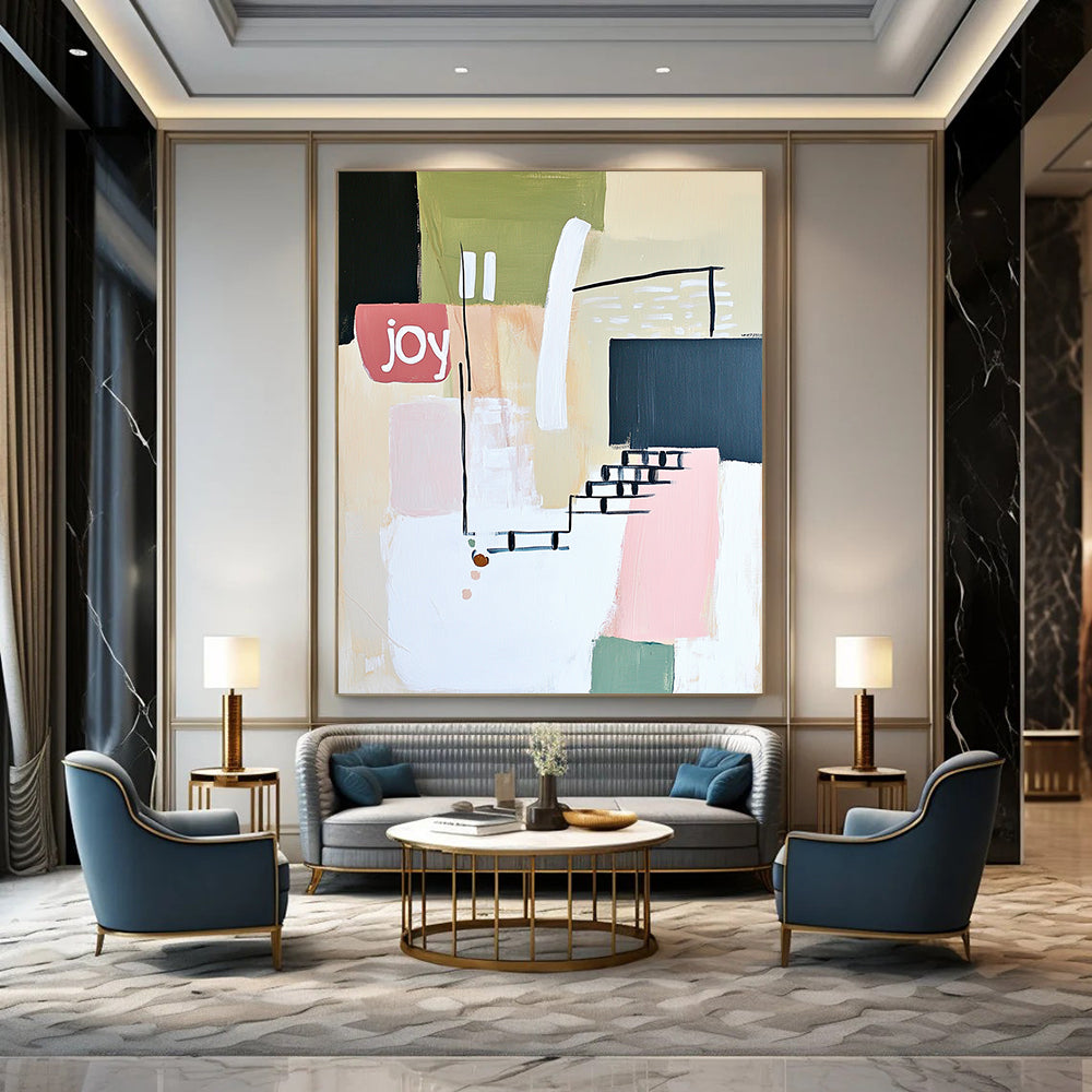 Minimal abstract painting with the word "joy" written in white, pale pink, and green, with soft lines and shapes, with a hint of a staircase in the background, in neutral colors.Create a seamless flow between your bedroom and hallway with our Large-Scale Hand-Painted Abstract Mural. In the bedroom, soft, dreamy designs promote relaxation, while in the hallway, the mural's abstract patterns guide the eye and add depth to the space. Incorporate elements like flowing lines, gentle gradients, or abstract floral motifs. Hand-painted with precision, it's perfect for "bedroom hallway mural" and "large hand-painted art", transforming these areas into a cohesive, artistic haven. Packing: Rolled and shipped in a solid tube. The painting come with EXTRA 2-3 inch white border around for stretching or framing.Delivery time: You will receive the painting around 7-12 days( 3-5 days to finish the painting, 5-7 days to your home.by UPS And Dhl)
