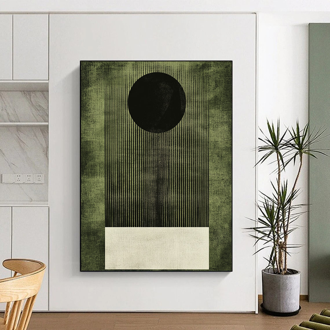 Minimalist, Japandi-style poster with a dark green background and a blank white square shape at the bottom of the screen, with an abstract illustration of a black circle above it, and a grainy texture.Extend the beauty of your living room to the hotel outdoor terraces with our Custom Hand-Painted Abstract Mural. In the living room, the mural serves as a focal point, adding warmth and personality to the space. In the hotel outdoor terraces, it creates a seamless transition between indoor and outdoor living, enhancing the overall ambiance. The mural can be customized with themes like nature, cityscapes, or abstract expressions of freedom. Hand-painted by skilled artisans, it's a great fit for "living room hotel outdoor terrace mural" and "custom hand-painted decor" searches, making your hotel a more inviting and memorable destination. Packing: Rolled and shipped in a solid tube. The painting come with EXTRA 2-3 inch white border around for stretching or framing.Delivery time: You will receive the painting around 7-12 days( 3-5 days to finish the painting, 5-7 days to your home.by UPS And Dhl)