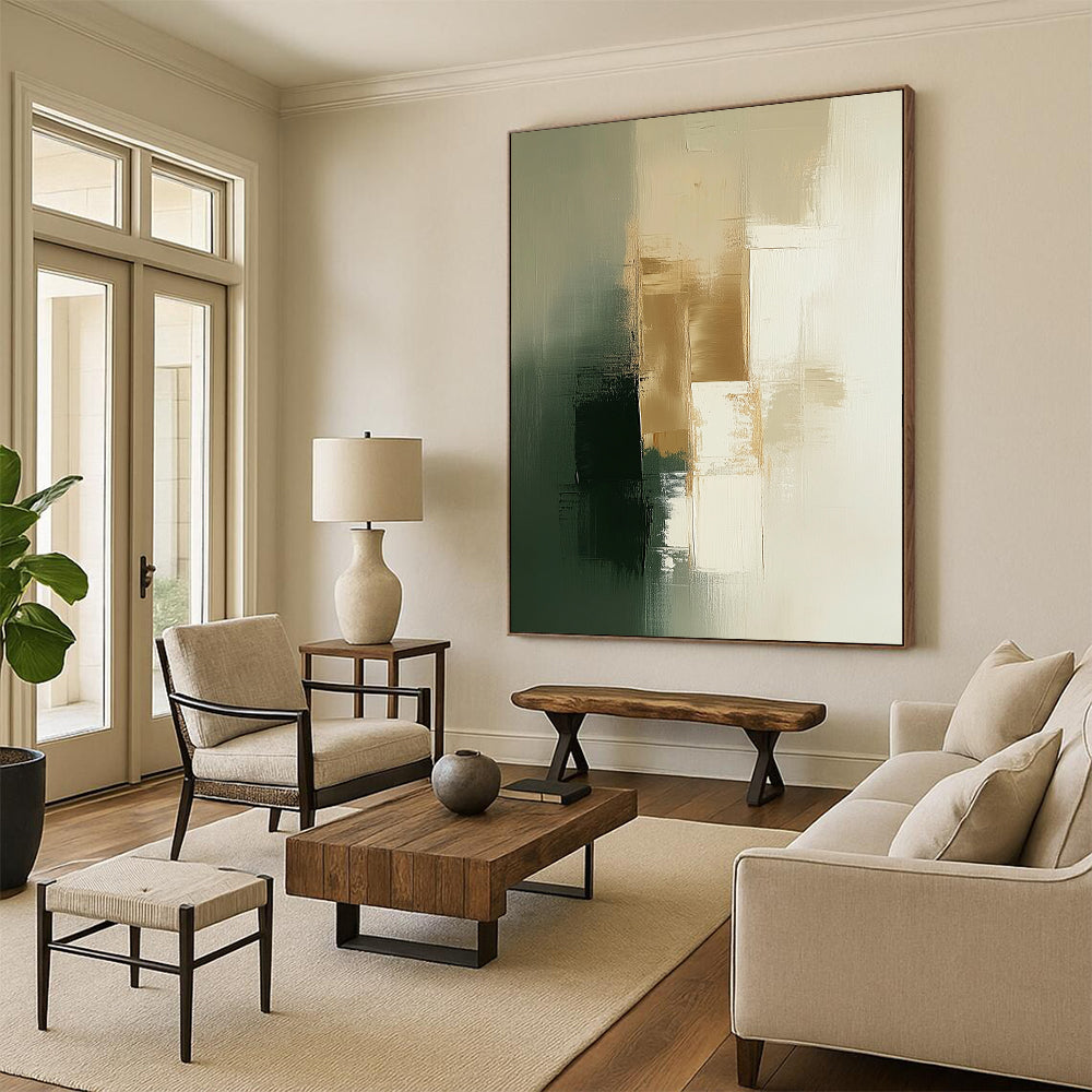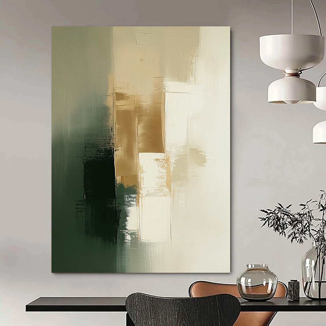 An abstract, minimalist painting with a harmonious blend of sage green and white colors, accented by small touches of gold, creating a calm and serene mood.Make diaper changes more delightful in your nursery with a vast made-to-order hand-painted abstract canvas for the changing table wall. Designed to soothe and engage your baby, it features gentle abstract motifs in soft colors. Hand-painted with non-toxic, hypoallergenic materials, this artwork creates a safe and visually appealing environment, making the changing area a pleasant part of your daily routine with your little one. Packing: Rolled and shipped in a solid tube. The painting come with EXTRA 2-3 inch white border around for stretching or framing.Delivery time: You will receive the painting around 7-12 days( 3-5 days to finish the painting, 5-7 days to your home.by UPS And Dhl)