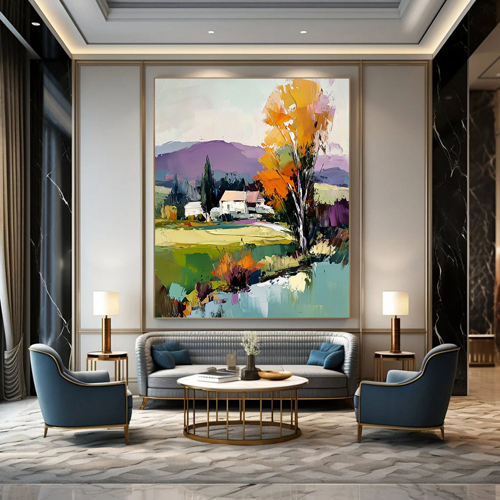 landscape with trees and house, pastel colors, oil painting, abstract brush strokes, impressionist, green grassy field, purple mountains in the background, small river flowing through landscape, trees with orange leaves, trees on left side of composition, foreground tree with yellow foliage, distant white buildings, sky is light blue with some clouds, soft focus, blurryCombine functionality and style in your office and bar with our Oversized Custom Hand-Painted Abstract Painting. In the office, it serves as a source of inspiration, sparking creativity and innovation among employees. In the bar, it adds a touch of elegance and personality, making it a great conversation piece for guests. The painting can be customized to reflect your professional brand in the office and your personal taste in the bar, with options to incorporate relevant themes, colors, and motifs. Hand-painted by experienced artists, it's an excellent choice for "office bar abstract painting" and "oversized custom art" searches, enhancing both your work and leisure spaces. Packing: Rolled and shipped in a solid tube. The painting come with EXTRA 2-3 inch white border around for stretching or framing.Delivery time: You will receive the painting around 7-12 days( 3-5 days to finish the painting, 5-7 days to your home.by UPS And Dhl)