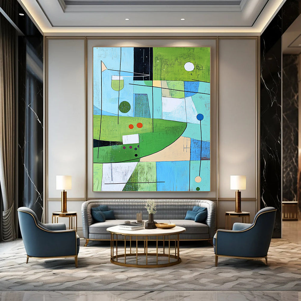 Abstract painting of a golf green, with lines and shapes in the style of Peter Riek, with small accents of color.Create a magical reading nook in your kids’ playroom with this large custom abstract canvas. Sized to fit the walls surrounding the reading area, it can be customized with whimsical abstract motifs that spark children's imagination. Whether it's shapes that resemble storybook characters or patterns inspired by fantasy worlds, our hand-painted canvas, made with child-safe materials, transforms the nook into a cozy, immersive space where kids can lose themselves in the joy of reading. Packing: Rolled and shipped in a solid tube. The painting come with EXTRA 2-3 inch white border around for stretching or framing.Delivery time: You will receive the painting around 7-12 days( 3-5 days to finish the painting, 5-7 days to your home.by UPS And Dhl)