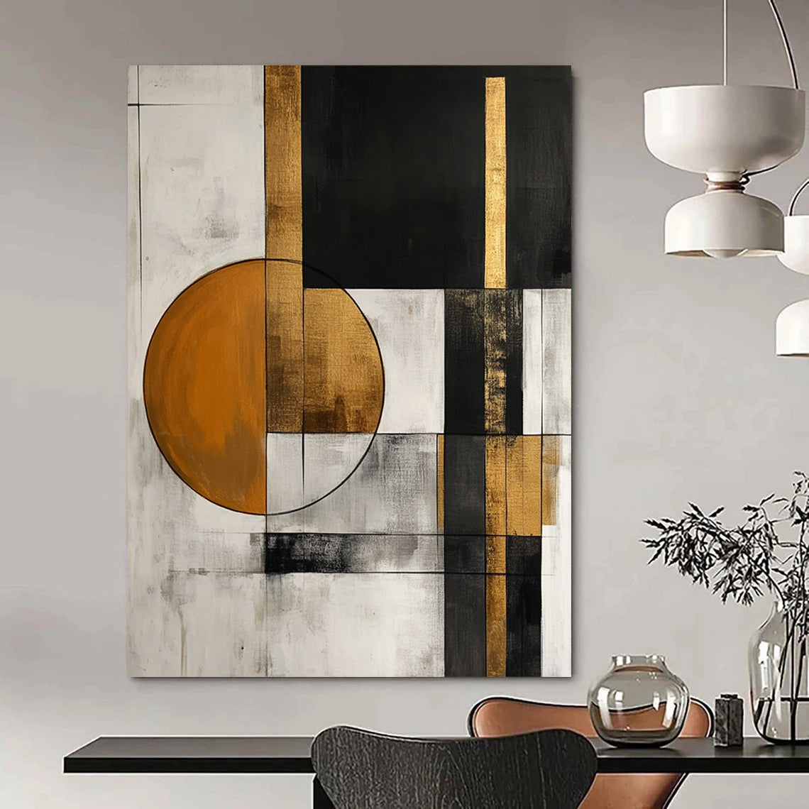 Abstract painting, with shapes and lines in white, black, gray, and gold, featuring an orange circle and simple shapes.Welcome guests and protect your home with oversized custom hand-painted abstract painting on the mudroom entry feature wall. Tailored to your space, it features customizable abstract designs that are both stylish and practical. Hand-painted with easy-to-clean materials, it withstands dirt and moisture, making the mudroom more organized and visually appealing. Packing: Rolled and shipped in a solid tube. The painting come with EXTRA 2-3 inch white border around for stretching or framing.Delivery time: You will receive the painting around 7-12 days( 3-5 days to finish the painting, 5-7 days to your home.by UPS And Dhl)