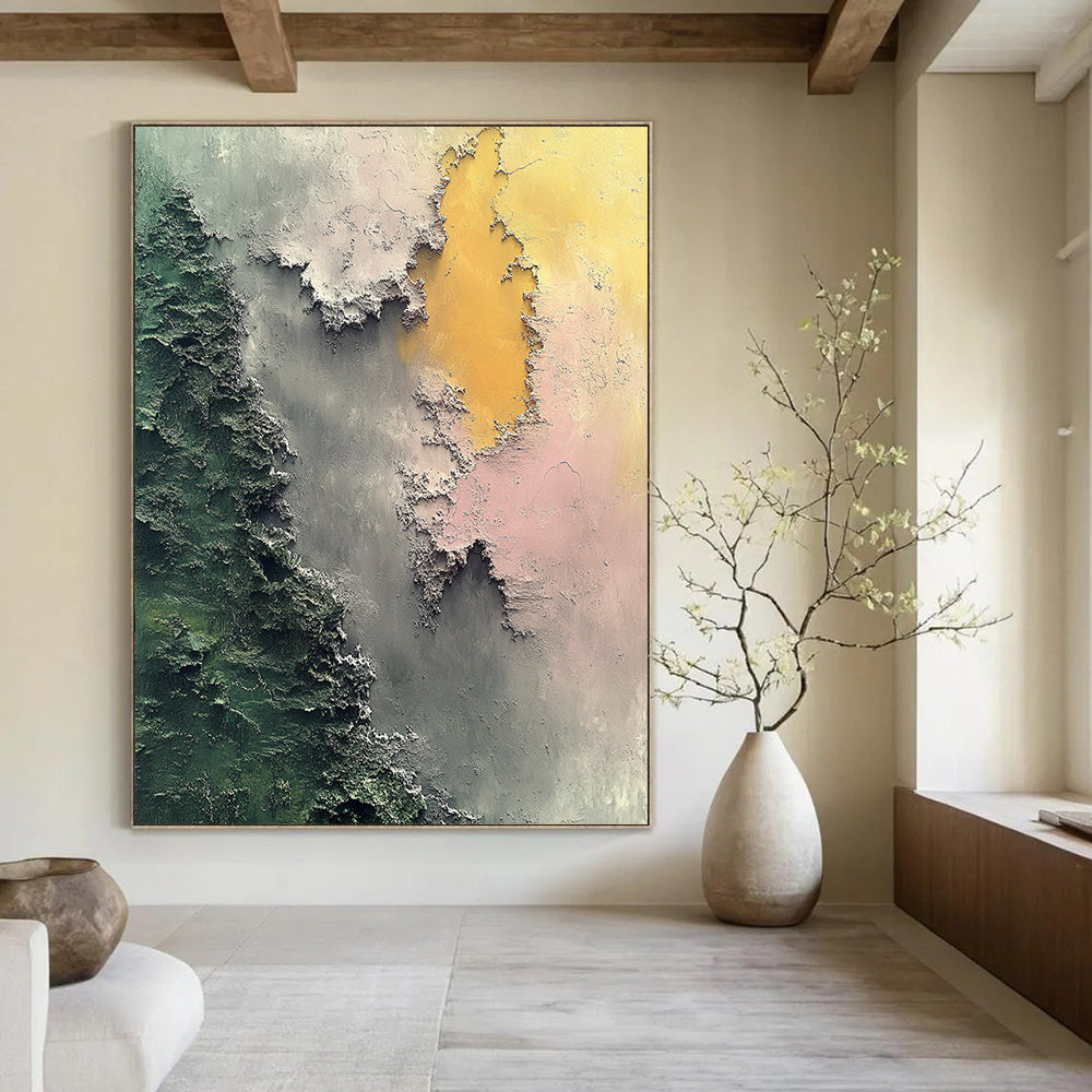 Abstract painting of an aerial view of the topography, with soft green and gray colors. The paint is faded in places, creating large white spaces. In these areas, there are yellowish stains that resemble watercolor splashes or strokes. It seems to me that you have painted a map on which two islands can be seen. One island has a natural light pink color, while the other one looks more dark gray. This scene creates an atmosphere of mystery and curiosity about what lies beyond those clouds., Canvas Texture,UHDEnhance the natural beauty of your sunroom with this monumental custom abstract painting, specifically designed for skylight ceiling panels. Tailored to fit the unique shape and size of the skylights, it features customizable abstract designs that interact with the sunlight, creating a dynamic and ever-changing display of light and color. Hand-painted with light-reflective materials, it maximizes the amount of natural light in the room while adding an artistic touch. The artwork's abstract patterns add a sense of depth and intrigue to the ceiling, making your sunroom a more immersive and visually stunning space. Packing: Rolled and shipped in a solid tube. The painting come with EXTRA 2-3 inch white border around for stretching or framing.Delivery time: You will receive the painting around 7-12 days( 3-5 days to finish the painting, 5-7 days to your home.by UPS And Dhl)