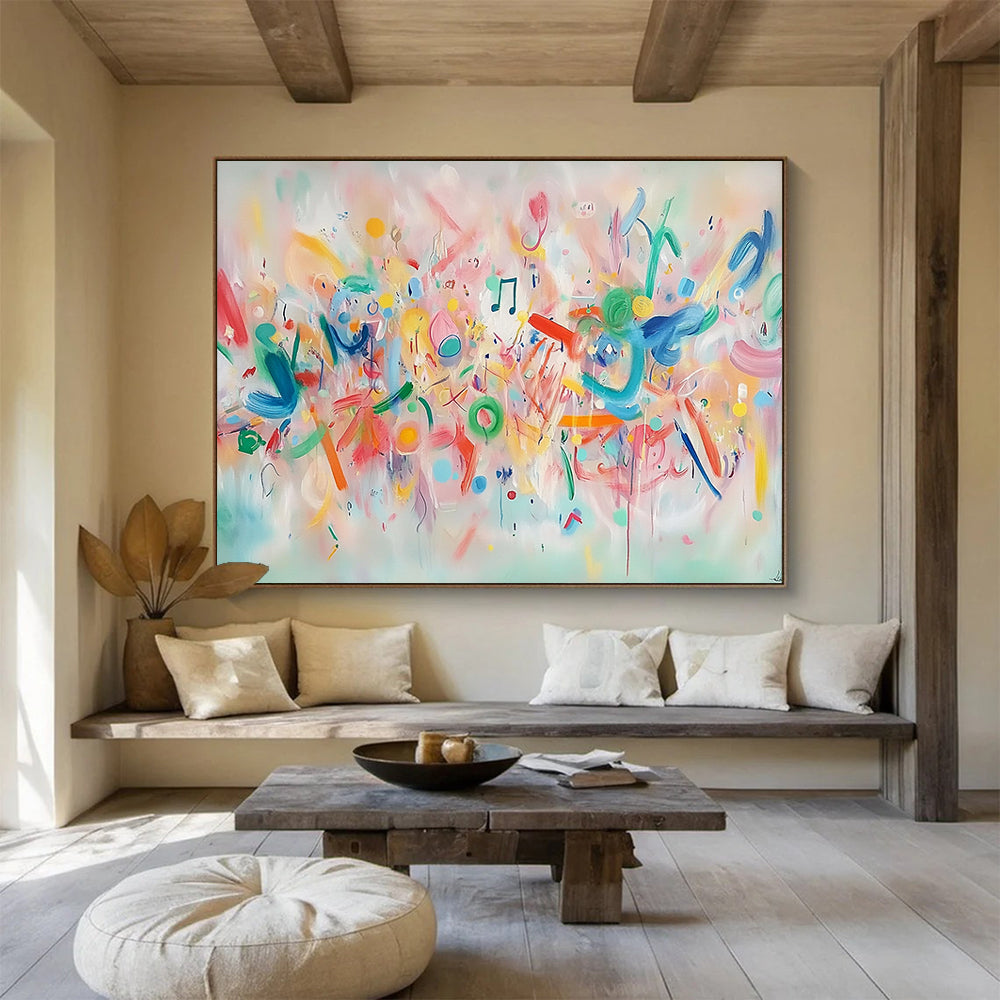 Soft pastels blend with musical notes and playful shapes—like a visual melody. Inspired by the intersection of art and music, the artist painted to the rhythm of their favorite tunes, creating a harmonious chaos. Great for a music lover’s bedroom or a creative studio. Let your walls sing—this art will infuse your space with the joy of melody and color, a must - have for those who hear art and see music. Packing: Rolled and shipped in a solid tube. The painting come with EXTRA 2-3 inch white border around for stretching or framing.Delivery time: You will receive the painting around 7-12 days( 3-5 days to finish the painting, 5-7 days to your home.by UPS And Dhl)