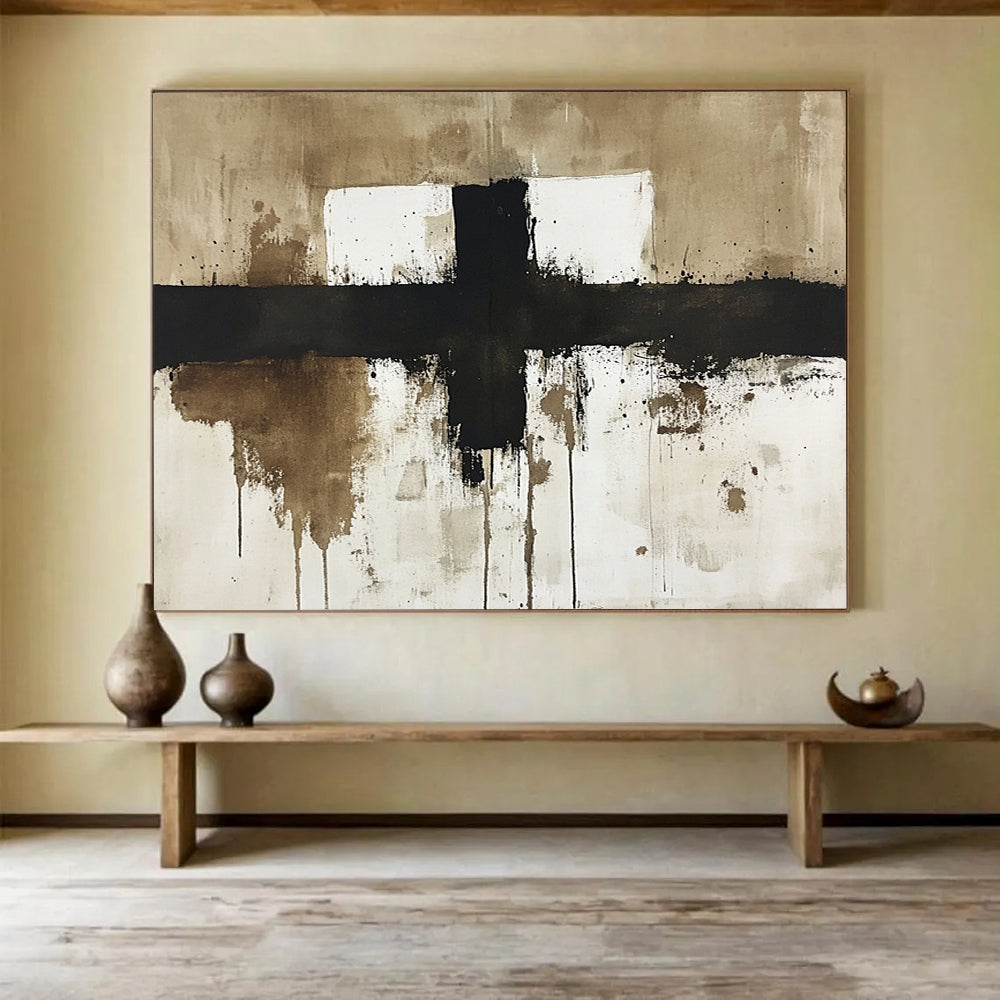“Minimalist Cross in Earth Tones” - Black, Brown, White, Simplified Cross with Dripping Effects - Abstract Ink - style Painting HB1767