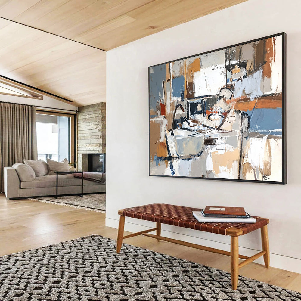 This captivating abstract acrylic piece brings the essence of a bustling kitchen to life. Inspired by the raw, unfiltered moments of daily domesticity, the artist spent hours observing the play of light and shadow in their own kitchen, translating the clutter and movement into bold brushstrokes. Echoing the expressive style of Willem de Kooning, it uses a palette of muted beiges, grays, and pops of blue. The chaotic yet familiar composition makes it a perfect fit for a modern kitchen diner, adding an artistic edge to meal times, or a contemporary studio apartment kitchen, where it can spark conversations about the beauty in everyday mess. Own a piece that turns the ordinary into extraordinary art. Packing: Rolled and shipped in a solid tube. The painting come with EXTRA 2-3 inch white border around for stretching or framing.Delivery time: You will receive the painting around 7-12 days( 3-5 days to finish the painting, 5-7 days to your home.by UPS And Dhl)