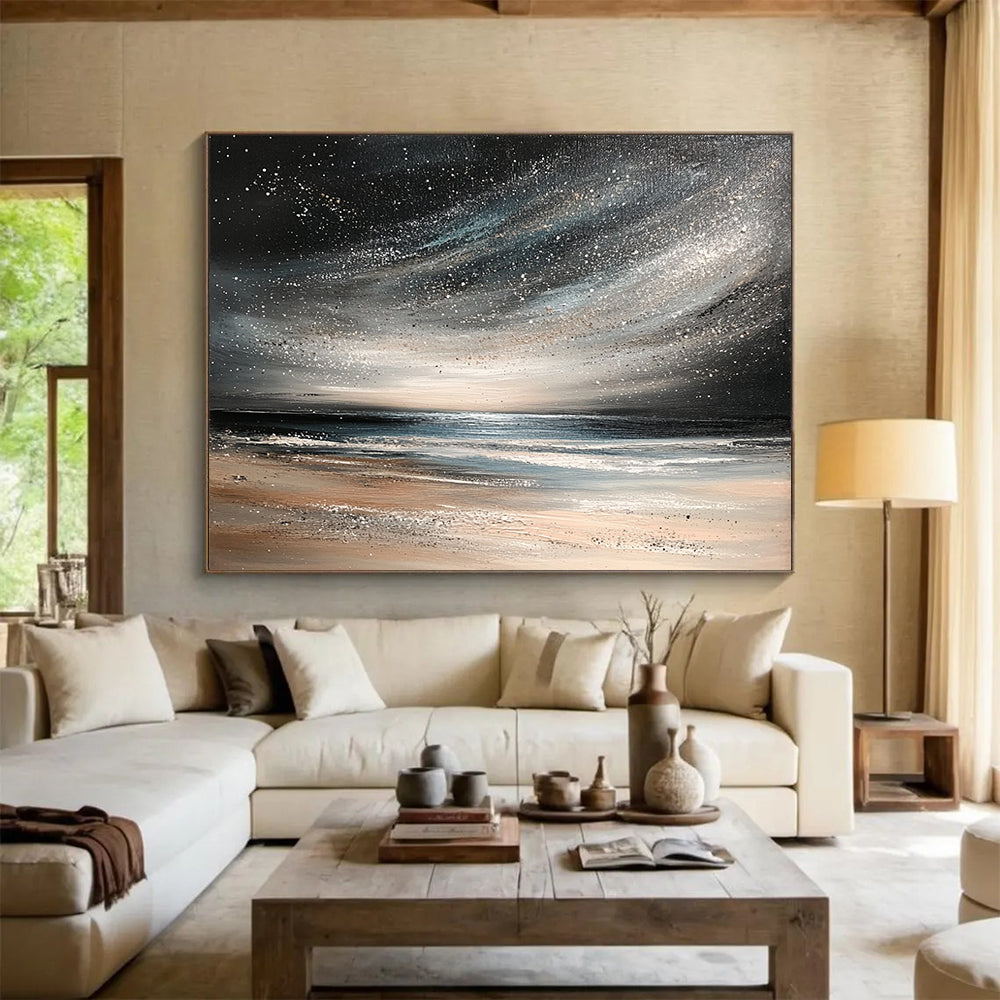 “Starry Night Beach” - Black, Silver, Beige, Celestial Seaside Scene Painting On Canvas HB1026