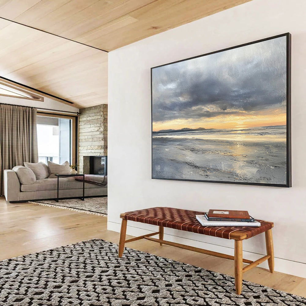 A stormy beach sunset in grays, oranges, and yellows. Channeling the dramatic impressionism of J.M.W. Turner, the artist captured the turbulent sky and sunset. Perfect for a man cave to add an edge or a living room to start conversations. Own this bold sunset and make a statement! Packing: Rolled and shipped in a solid tube. The painting come with EXTRA 2-3 inch white border around for stretching or framing.Delivery time: You will receive the painting around 7-12 days( 3-5 days to finish the painting, 5-7 days to your home.by UPS And Dhl)