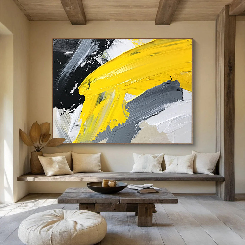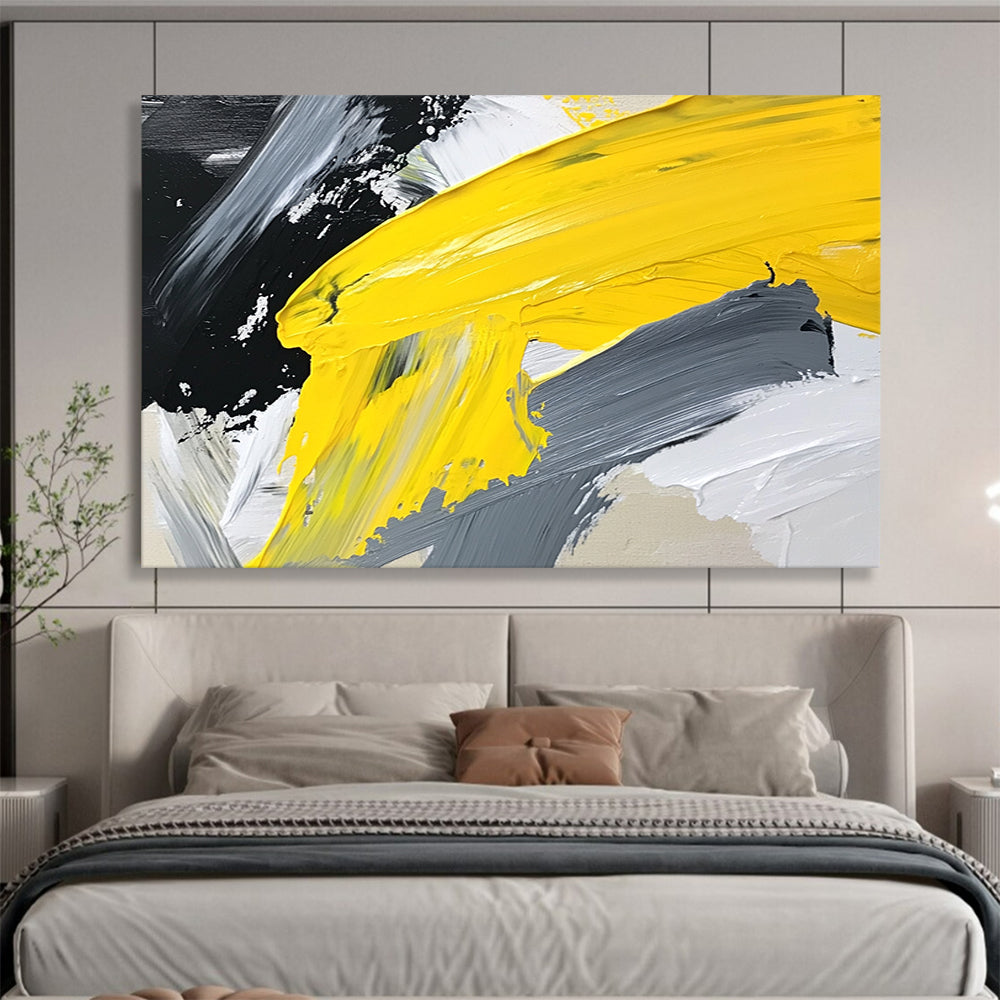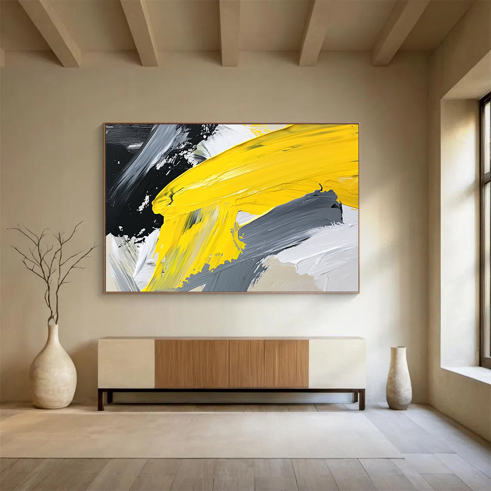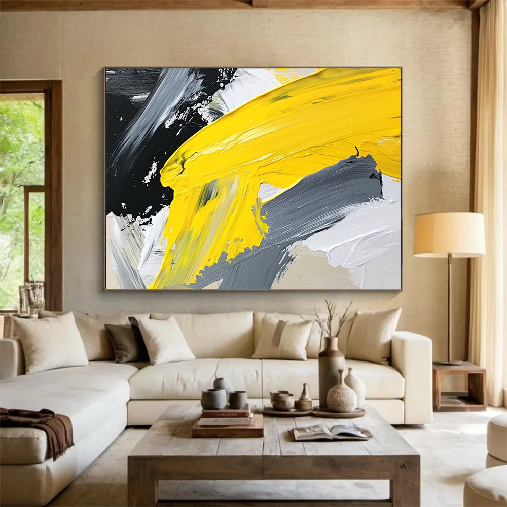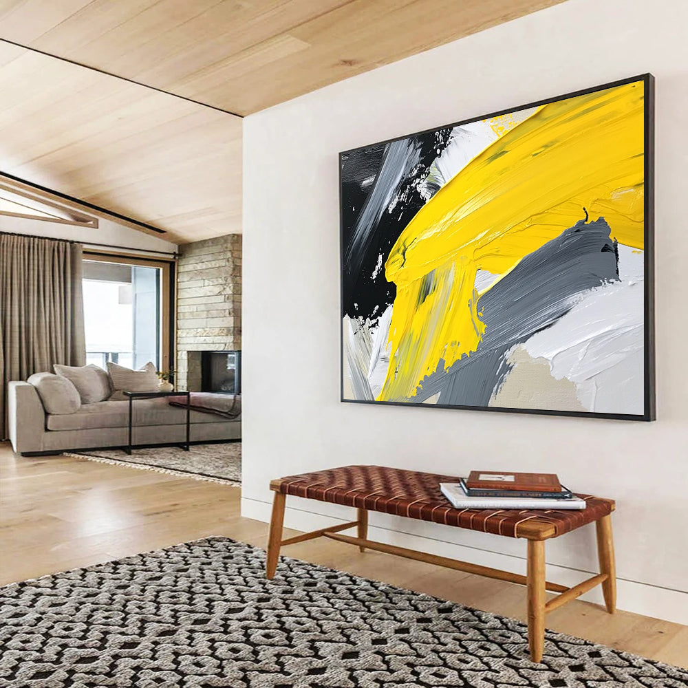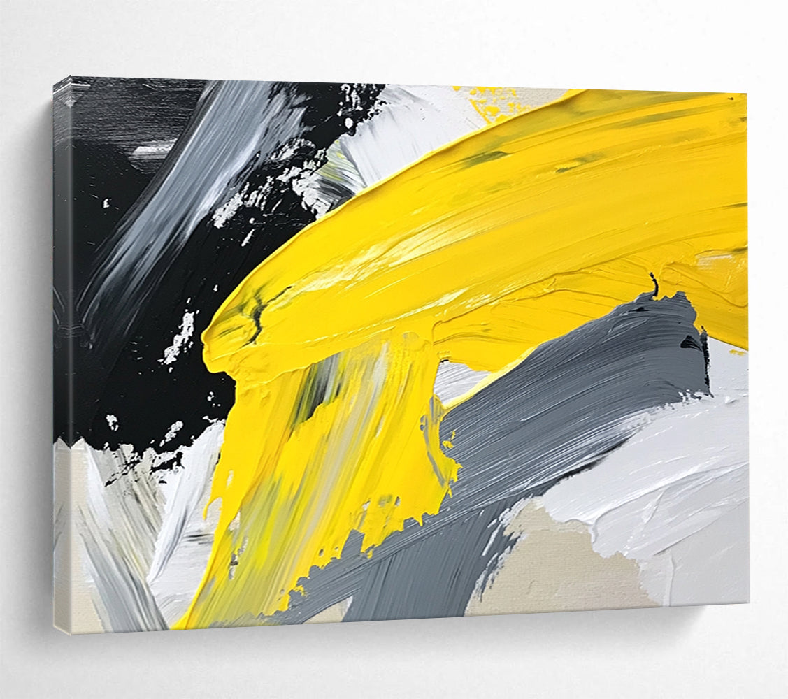 Thick layers of bright yellow and muted gray overlap on a white base, forming a tactile, abstract composition. Channeling the bold color - blocking of Hans Hofmann, the artist built up paint to create depth. Ideal for a minimalist office to liven up the decor or a trendy cafe wall. Elevate your space with this modern, textural piece! Packing: Rolled and shipped in a solid tube. The painting come with EXTRA 2-3 inch white border around for stretching or framing.Delivery time: You will receive the painting around 7-12 days( 3-5 days to finish the painting, 5-7 days to your home.by UPS And Dhl)